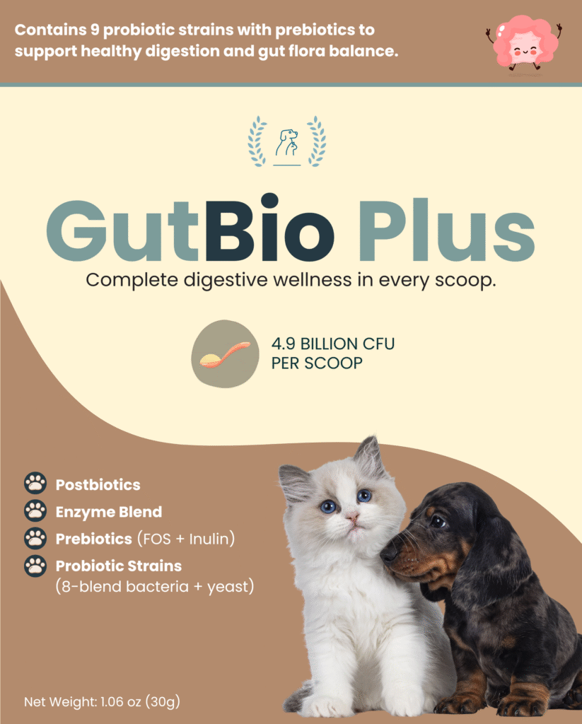 GutBio Plus is a comprehensive digestive support powder designed to help maintain a healthy gut and smooth digestion in dogs and cats. It combines bacterial probiotics, a probiotic yeast, prebiotics, postbiotics, and digestive enzymes to promote balanced gut flora and optimal nutrient absorption. This multi-action formula supports normal stool quality, reduces digestive discomfort, and helps strengthen the intestinal barrier. Pumpkin and rosemary extract provide additional natural support for sensitive stomachs. Gentle, effective, and flavorless, GutBio Plus is ideal for daily gut wellness or during periods of gastrointestinal stress.
